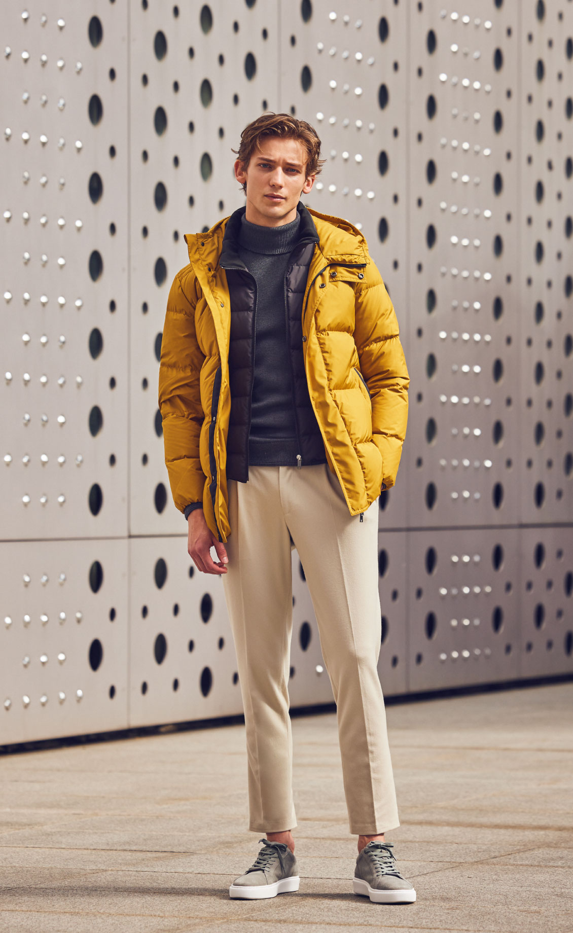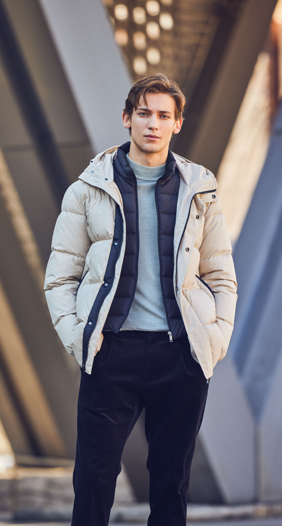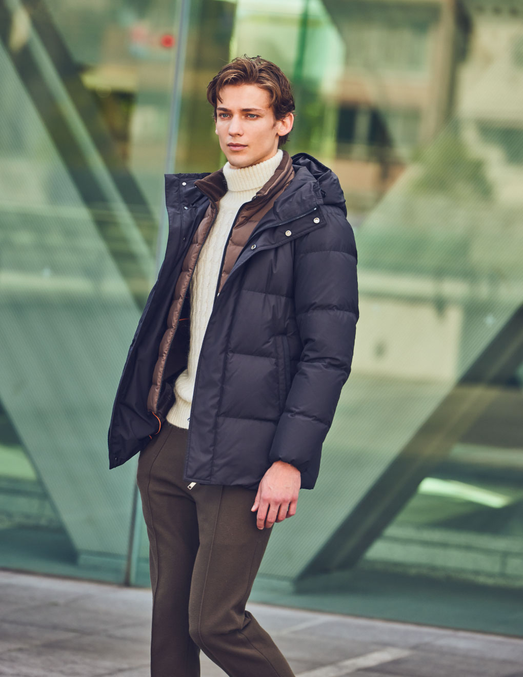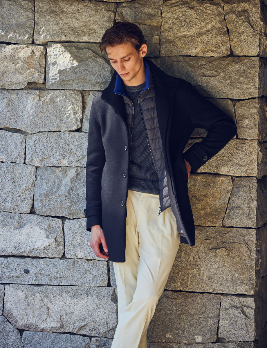 冬ともなれば防寒対策は必須。そこで、ダウンや中綿入りのアイテムに頼もしさを感じますが、ネガティブポイントを上げるとしたらラフさやアウトドア感。ただ、イタリアの実力派生地メーカーのポテンシャルを存分に感じさせるコート一着でその不安材料は一掃できます。ひとたび合わせれば機能中綿をいれたナイロンレイヤードカラーがいい抜け感に。カラー衿の茶目っ気も存分に活かされるでしょう。スラックスを選ぶことでシックさはさらに上乗せされ、ほっこりするコーデュロイ生地のホワイトボトムスによりクリーンさと親近感のある着こなしが可能になります。