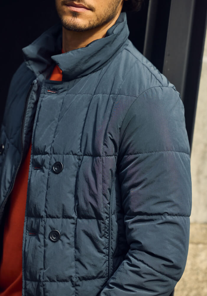 こちらはさらにアウターの一面が色濃く出た一着といえるでしょう。キルトステッチを走らせた高密度タフタ生地の内側には、プリマロフト®︎を封入。ダウンと異なり水に強く、嵩の減退も防げるため保温性は高水準でキープされます。とはいえ、ヌメリ感と超高収縮加工によるきめ細やかな風合いが顕著なオモテ生地と程よい光沢を放つシャンブレーのライナーが品位を担保。シェイプしたウエストが美しいアウトラインを描き、鮮やかなニットとのコンビでも落ち着いた雰囲気を演出します。