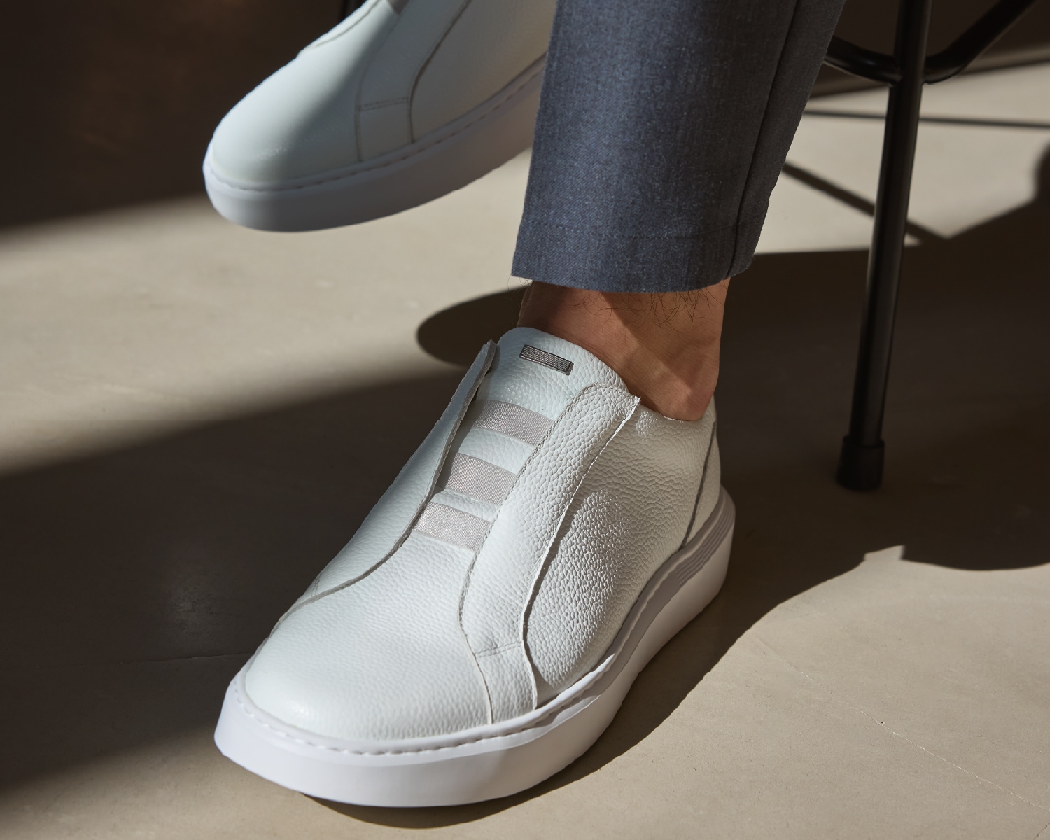 大人スニーカーの新たな基準を提案してきた DEVICE 1 は、デザインにおいても“スニーカーらしさ”を象徴するシューレースの存在は重要な要素です。しかし今回、その象徴をあえて取り払うという大胆なアプローチを選択。シュリンクレザーのアッパーやガラスレザーのヒールパッチが持つ質感の美しさが、よりいっそうクリアに際立つ一足に仕上がりました。気になるホールド感については、デザインアクセントにもなる3本のラバーストリングスがしっかりとサポート。ミニマルでありながら、汎用性と快適さを両立させています。
