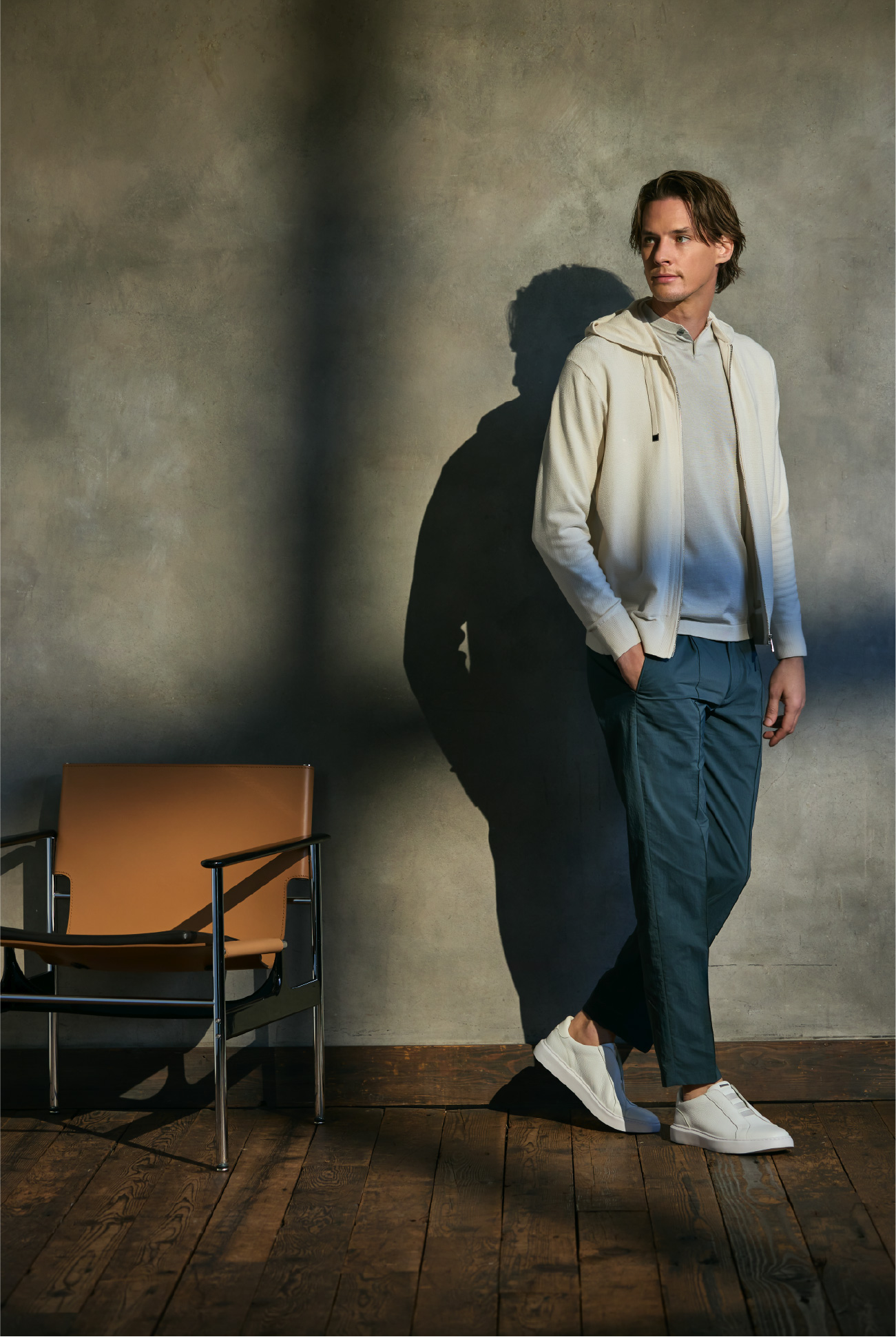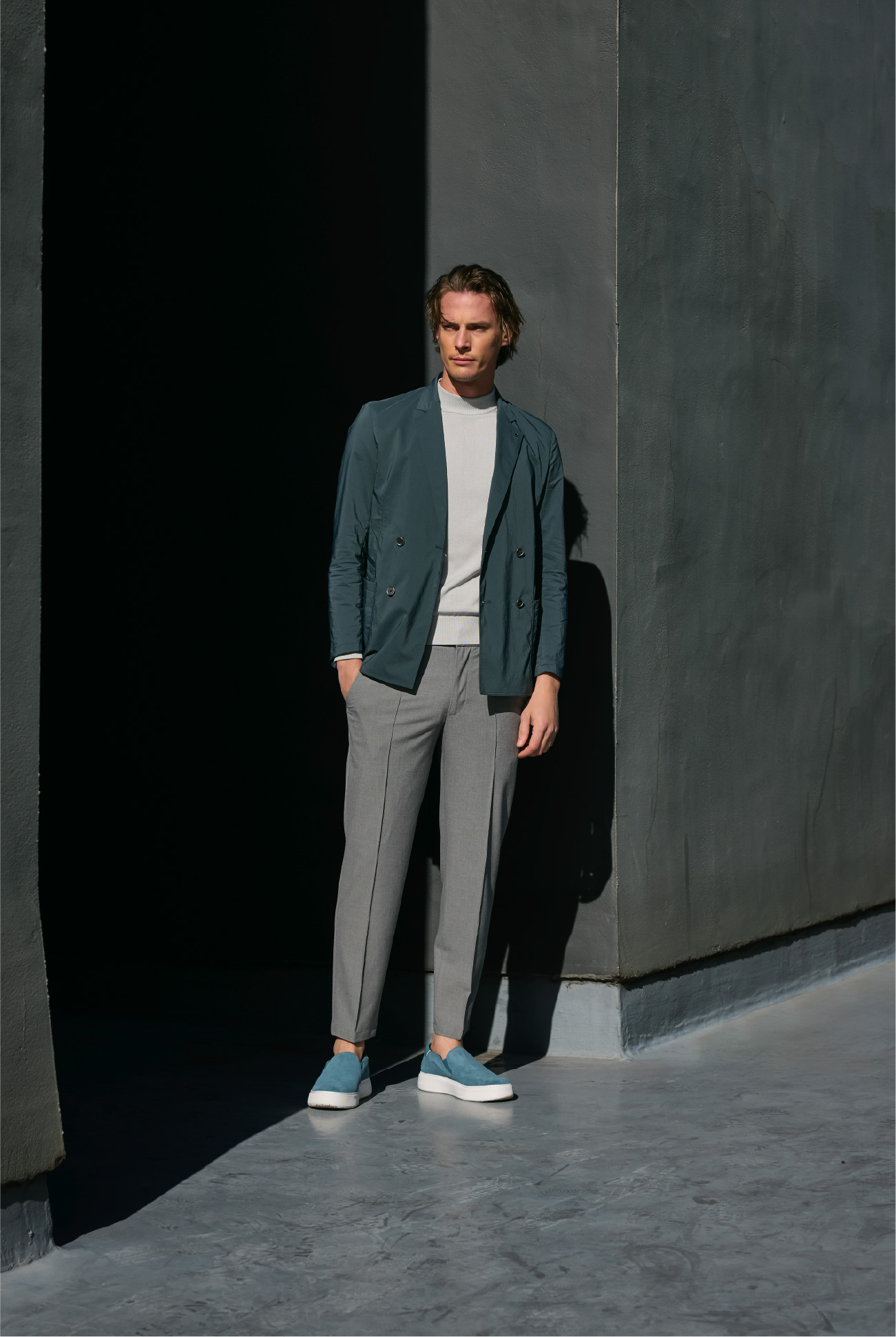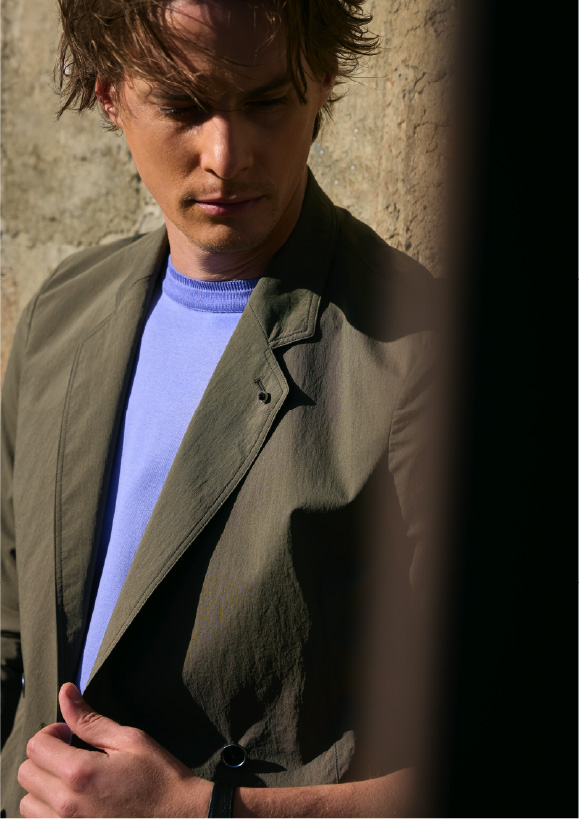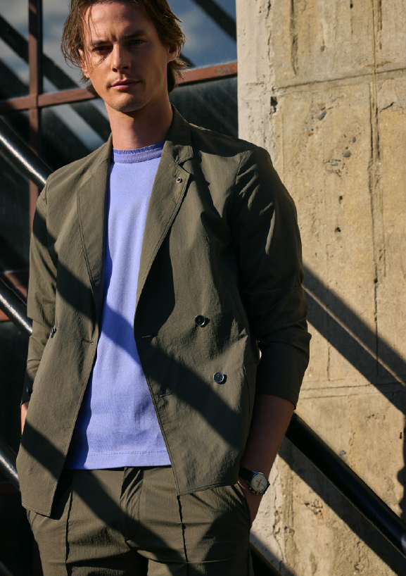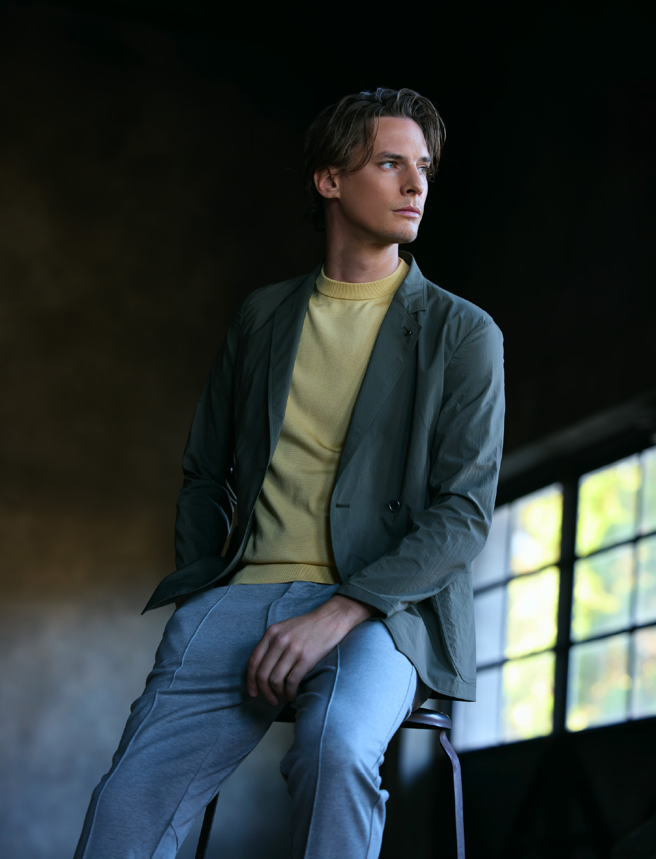 ダブルブレストジャケットに威厳が宿るのは、英国海軍のオフィサージャケットを起源に持つため。もともとは防寒着であり、ヨットクラブの制服としても着られてきた背景があります。品の良さと軽やかな着心地、伸縮性を備えた一着なら、コンフォートなパンツとも好相性。ラフさが気になる場合は、表にシルク、裏にコットンを用いたニットを合わせると、印象が整います。