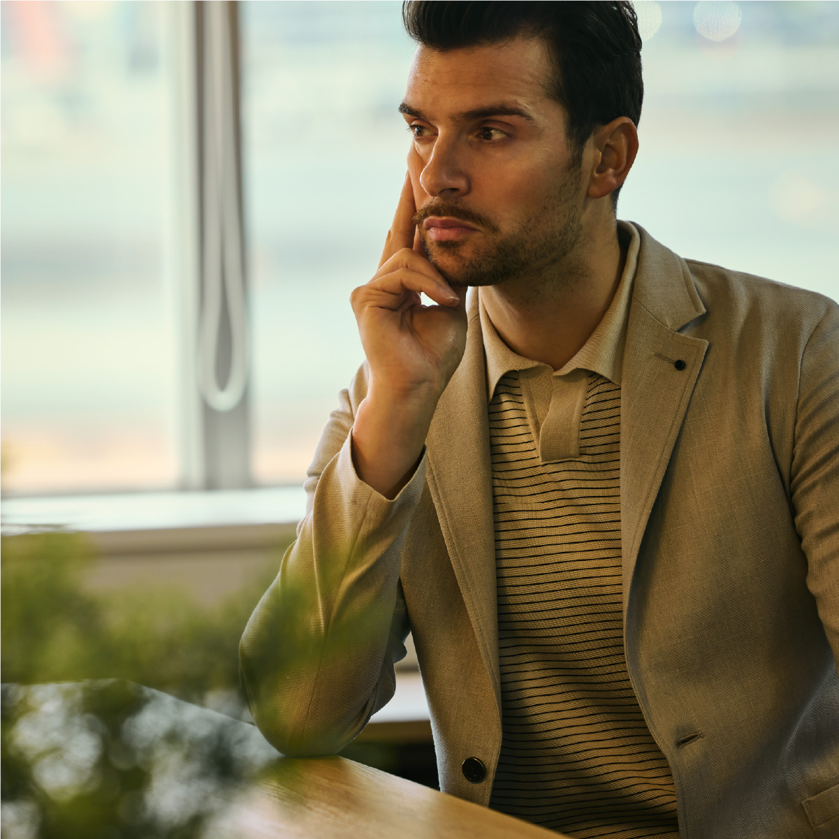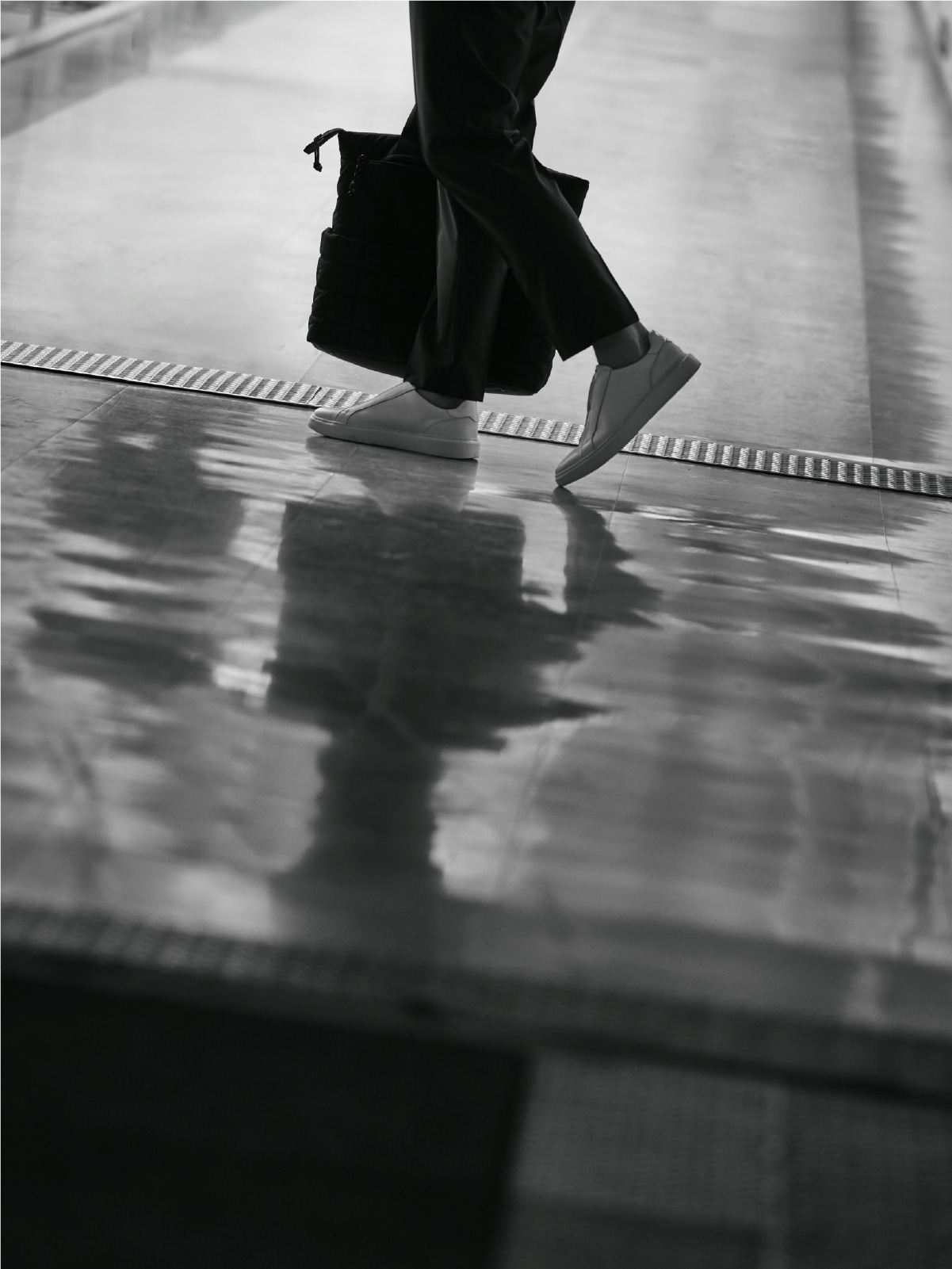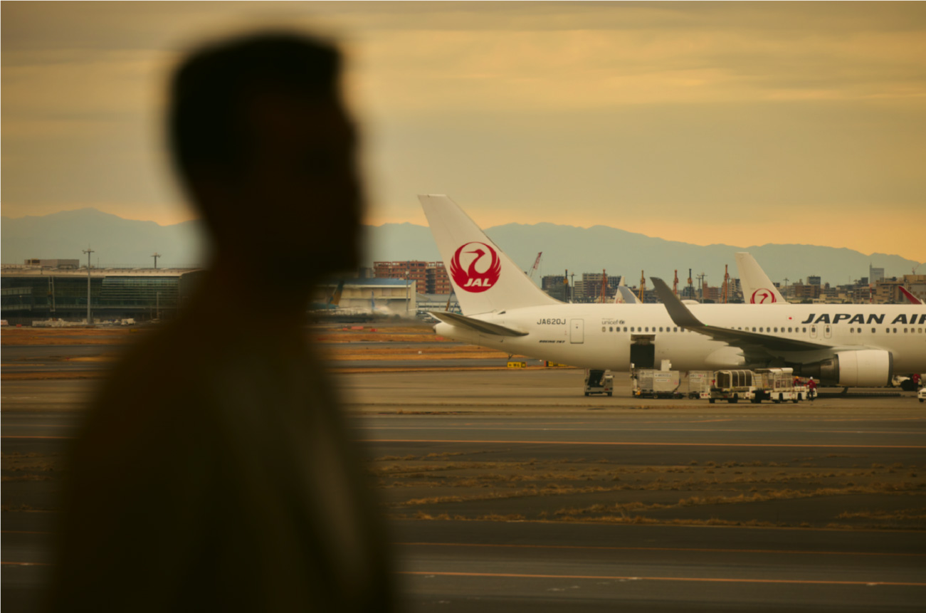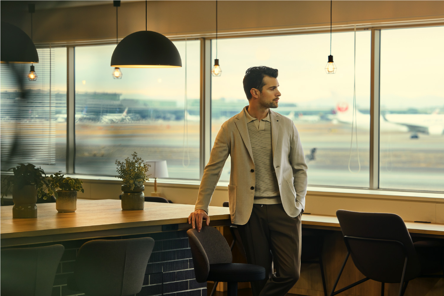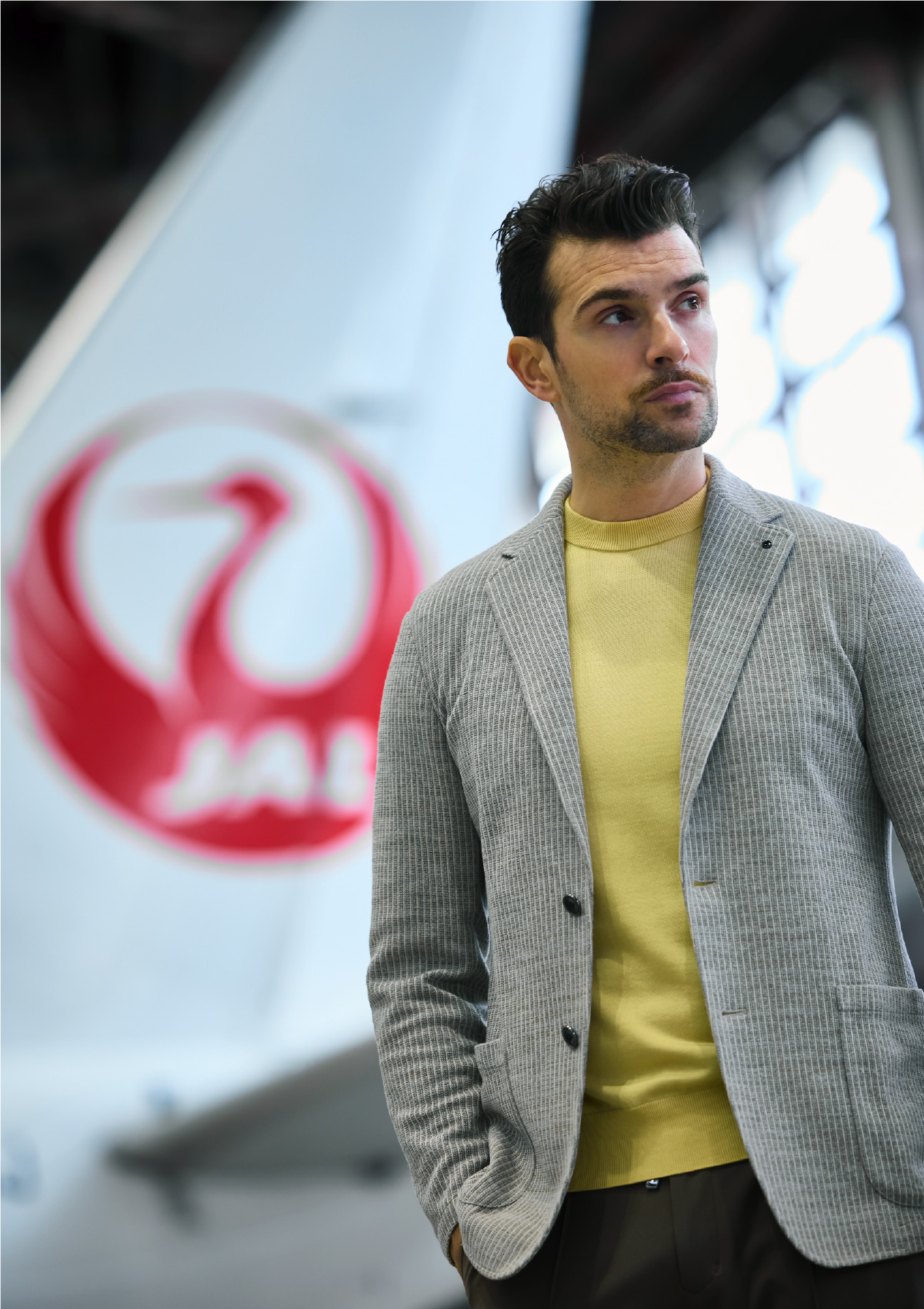 空港のラウンジで静かにフライトを待つひととき。 ウール×麻の上品な風合いとさりげないヘリンボーン柄の ジャケットが内に秘める緊張と興奮を優しく包み込みます。