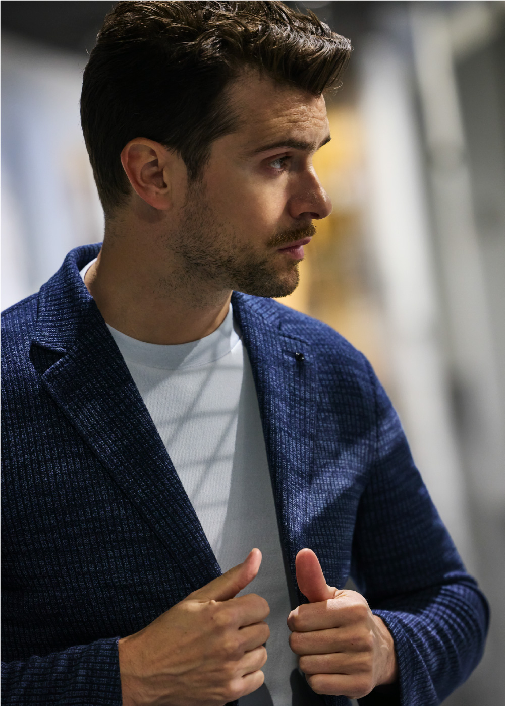 機敏に動く方にこそ、ノンストレスな服を。 伸縮自在なジャケットに洗えるシルク製ニットなら、 表情にも余裕が生まれます。